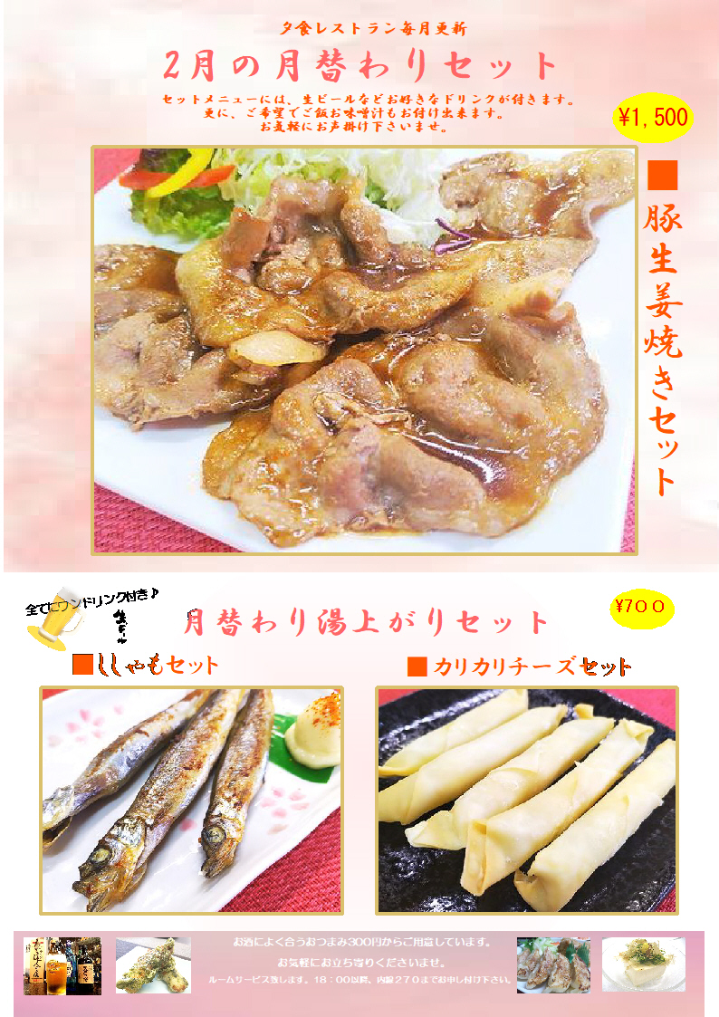 2026年2月の夕食月替わり限定メニュー♪ 掲載日:2026年01月30日 こんにちは♪ 2026年2月の限定メニューです♪ 夕食レストランでは、毎月通常メニューの他に限定メニューをご用意しています♪ ご来店お待ちしています(^^♪ 通常メニューはこちら♪